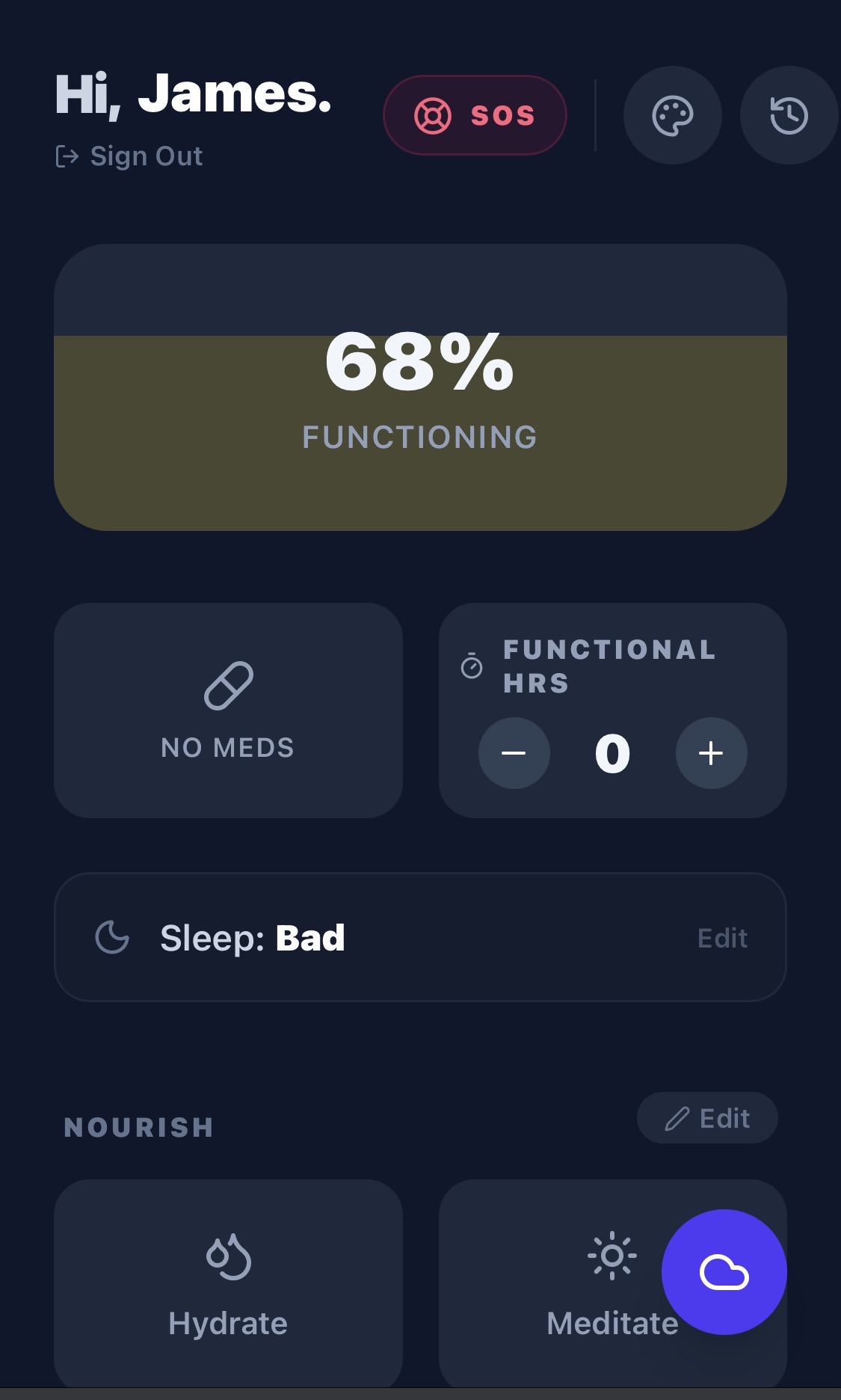 Meds: A simple “Yes/No” toggle. Did you take them? Tap it to turn it Blue.