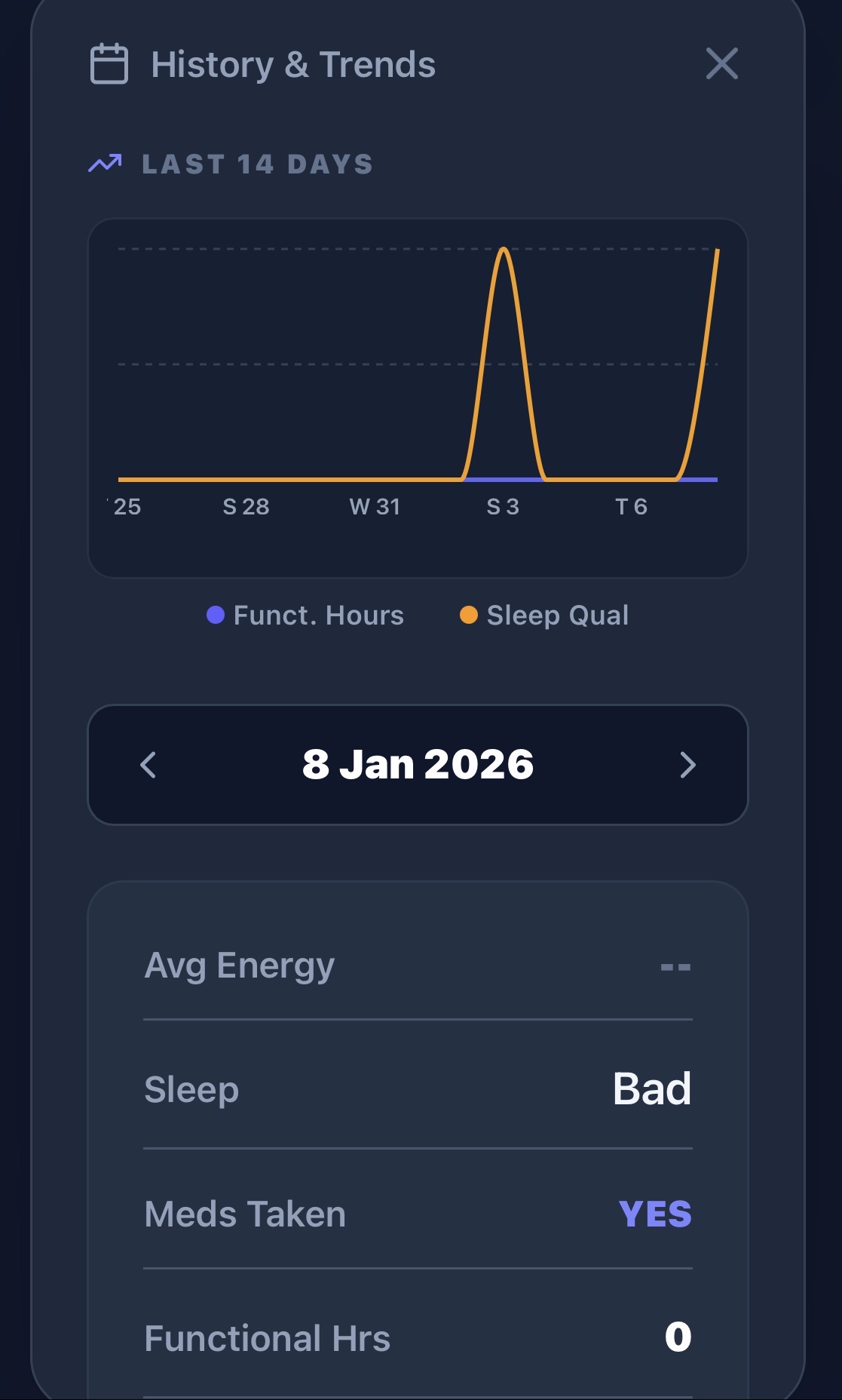 Functional Hours: Use the (+) and (-) buttons to roughly track how many hours you felt “online” or productive today. No need to be exact—gut feeling is fine!